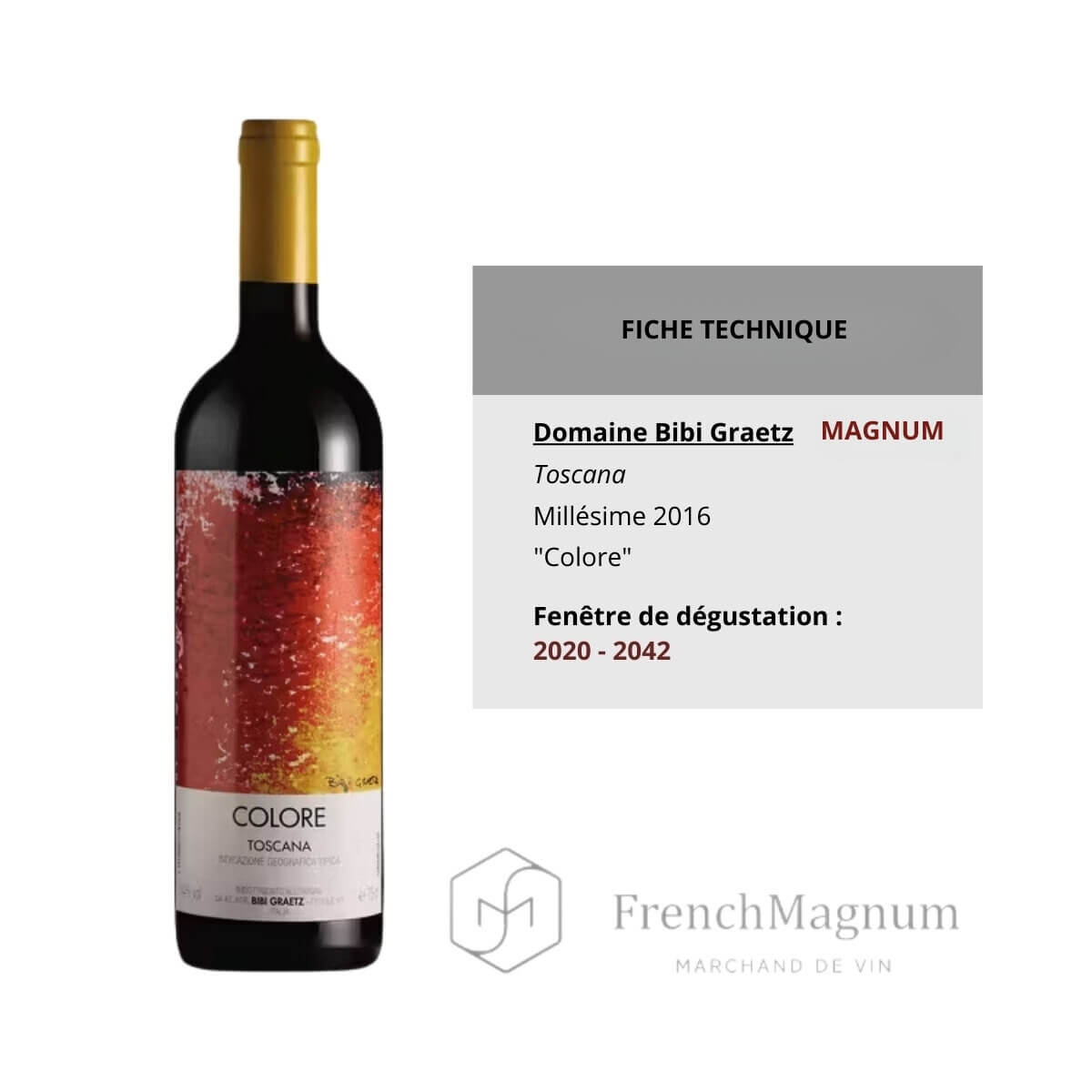Le Magnum Bibi Graetz « Colore » 2016 est un vin rouge prestigieux provenant de la région de Toscane en Italie, élaboré principalement à partir de raisins Sangiovese. Ces derniers sont complétés par des cépages indigènes tels que le Canaiolo et le Colorino. On considère souvent ce millésime comme une expression exemplaire du terroir toscan, offrant une expérience de dégustation riche et complexe.