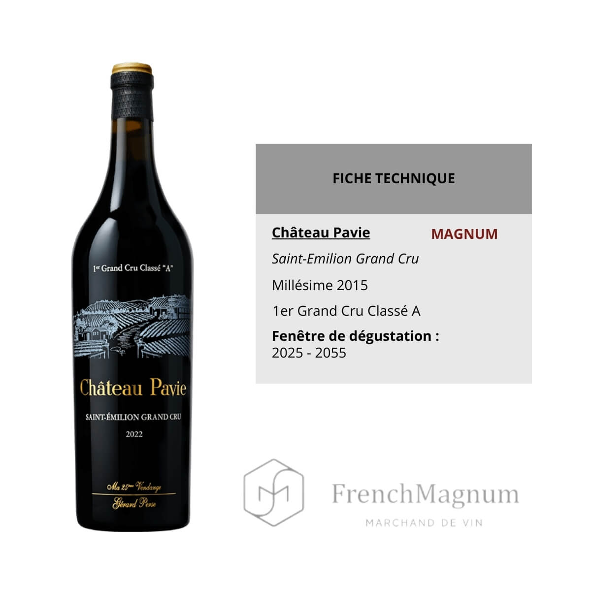 Le Magnum Château Pavie 2015 incarne l’excellence et le savoir-faire de Saint-Émilion. Sous la direction méticuleuse de Gérard Perse, ce millésime est célébré pour son équilibre parfait et sa profondeur. Chaque bouteille est une promesse de qualité et de raffinement.